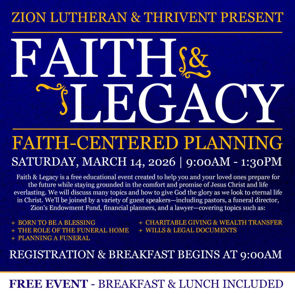 At Zion, we've been part of our community for over 170 years, and we're excited about what the future holds. Our focus is on making a lasting difference by connecting people to Christ through community service and Christian education. Whether you're new here or already part of our family, we look forward to walking with you in faith. Check out our upcoming events, classes, and ways to get involved. Let's make a difference together, today and for generations to come.